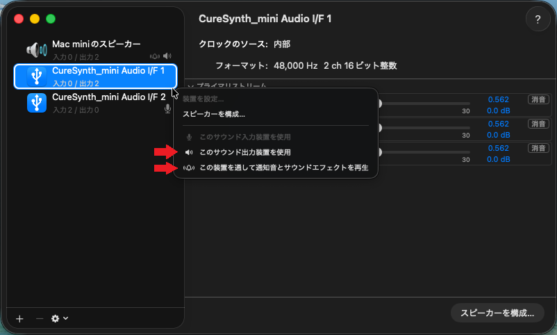 アプリより「Audio MIDI設定」を開くと、以下のように「CureSynth_mini Audio I/F」が2つ表示されます。上が出力デバイスで下が入力デバイスです。