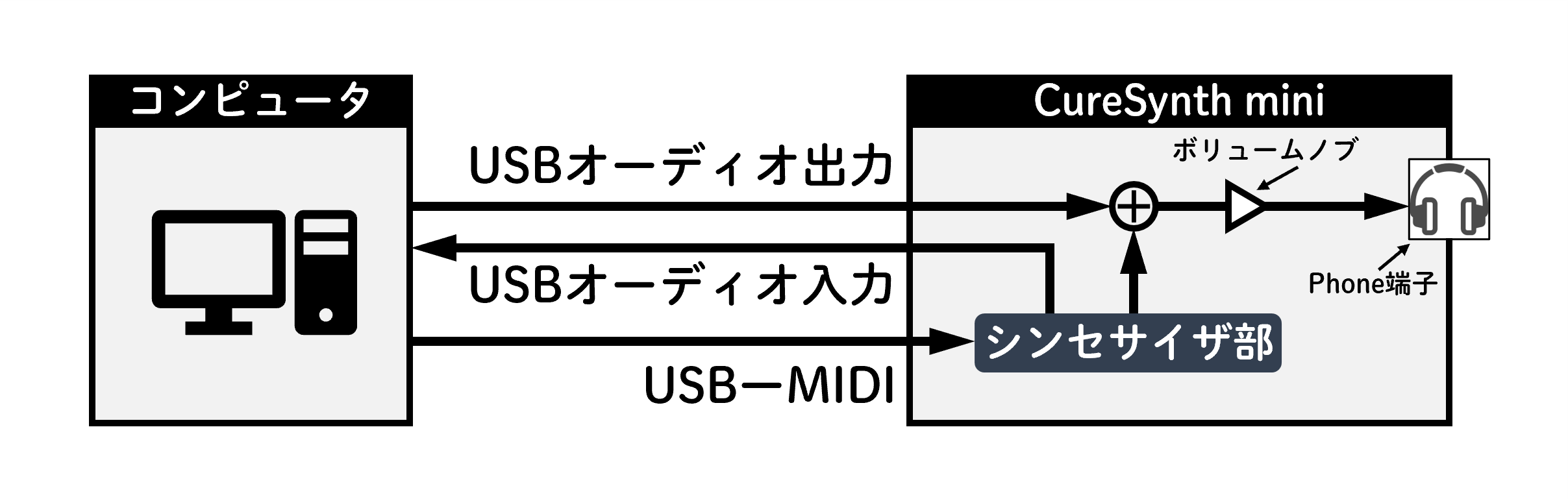 上図はUSBオーディオ機能の概略図です。コンピュータの「USBオーディオ出力」が、シンセサイザーの音とミックスされ、Phone端子に出力されます。また、シンセサイザーの音は、コンピュータの「USBオーディオ入力」に戻ります。