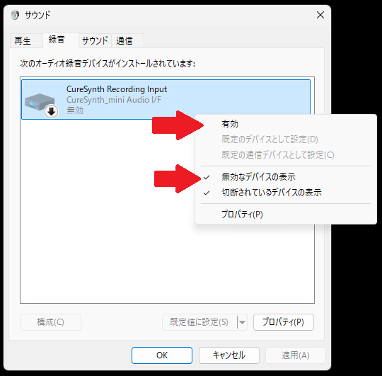 - 再生タブの「CureSynth Audio Out」または録音タブの「CureSynth Recording Input」を右クリックし、「有効」をクリックする。